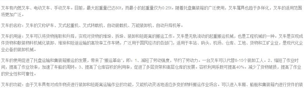 卸搬運作業(yè),經(jīng)濟地滿足各種短途物料搬運車作業(yè)的要求。叉車以內(nèi)燃機或蓄電池與電動機為動力,帶有貨叉承載裝置,具有自行能力,工作裝置可完成升降和前后傾、夾緊、推出等動作,能實現(xiàn)成件物資的裝卸、搬運嗯哼拆碼垛作業(yè)。若配備其他屬具,還能用于取大件貨物散裝物資和非包裝物資的裝卸作業(yè)以及牽引和吊裝等工作。從而有效地減輕勞動強度,提高生產(chǎn)率,降低經(jīng)濟成本,增強作業(yè)性